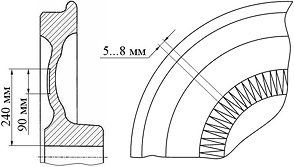 Контроль круговым сканированием на расстоянии 5-8 мм от фаски по наружной поверхности обода.