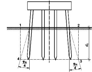 где Nc — нормальная составляющая давления условного фундамента на грунт основания, кН, определяемая с учетом веса грунтового массива 1 – 2 – 3 – 4 вместе с заключенными в нем ростверком и сваями или опускным колодцем;