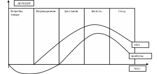 Класичну модель життєвого циклу товару представляють у вигляді графіка, який ілюструє динаміку обсягів продажу і прибутку за весь час перебування товару на ринку (мал.1). Типовий життєвий цикл товару (ЖЦТ) має 5 етапів: розробка; впровадження; зростання; зрілість; спад.