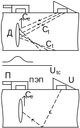 Излучаемый ПЭП озвучивает дефект поперечными (сдвиговыми) волнами. Часть падающего на плоскость дефекта УЗ пучка зеркально отражается от дефекта; другая часть дифрагируется (рассеивается) ввиде поперечной волны, или ввиде продольной волны.