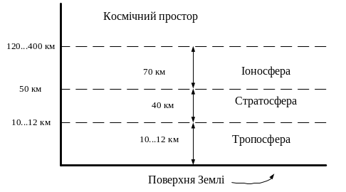 У радіолініях зв’язку середовищем поширення електромагнітних хвиль у переважній більшості випадків (за винятком випадку зв’язку між космічними апаратами) є атмосфера Землі. На рис. 9 приведено спрощену побудову атмосфери Землі.
