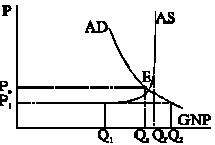 2. При достижении равновесия на промежуточном отрезке совокупного спроса любые изменения значения P и Q, кроме Pе и Qе, заставят производителей и потребителей стремится к равновесному уровню. Предположим, что рыночная цена – Р1. При таком ее уровне производители готовы предложить рынку объем производства Q1 (причем Q1 < QЕ), а потребители купить национального продукта в объеме Q2 (Q2 > QЕ). Вследствие этого, превышение спроса над предложением будет стимулировать рост до уровня РЕ и увеличение национального производства до объема QЕ.