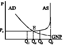 1. В случае равновесия на кейнсианском отрезке уровень цен не влияет на изменение макроравновесия. Производство большего объема национального производства – Q2 – не было бы обеспечено платежеспособным совокупным спросом, а производство в объеме Q1, т.е. меньше равновесного уровня, будет стимулировать рост производства, т. к. в обществе существует неудовлетворенный спрос.