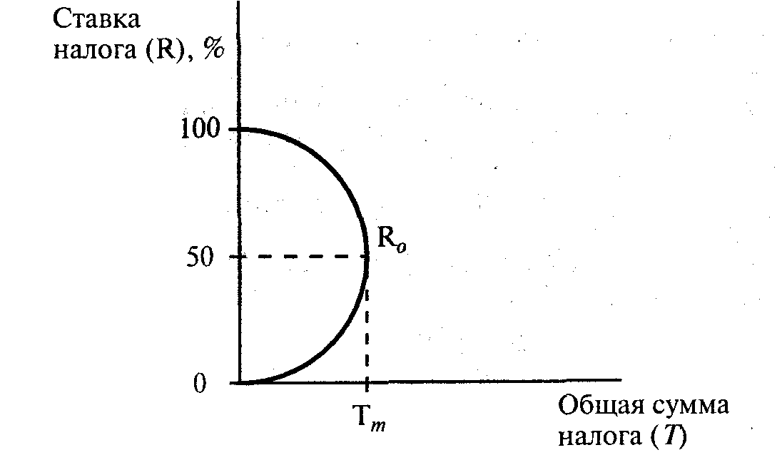 Кривая отражает взаимосвязь между величиной ставки налогов и поступлением за их счет средств в государственный бюджет. При повышении ставки налога доходы государства за счет налогов вначале увеличиваются. Если налоговая ставка превышает некую границу – точку R0, то доходы от налоговых поступлений начинают уменьшаться. Высокие налоги снижают стимулы производства и уменьшают доходы государства за их счет, и наоборот. Снижение налогов в таком случае улучшает состояние государственных финансов.