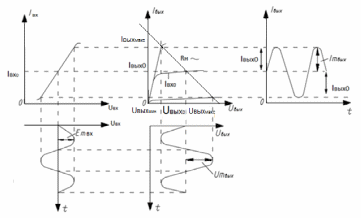 При наличии входного сигнала напряжение и ток во входной и выходной цепях представляют собой суммы постоянных и переменных составляющих. При увеличении мгновенное напряжение на коллекторе уменьшится и его приращение будет равно