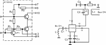 Принципиальная схема каскада усиления промежуточной частоты на микросхеме К118УН2 приведена на рис. 1.37б. Нагрузкой каскадного усилителя является избирательная система C5L2. Недостатком каскодных схем с последовательным соединением транзисторов является необходимость более высоких напряжений источников питания по сравнению с обычным каскадом.