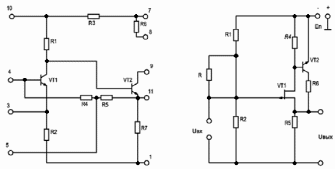 Выводы 3,5,10,11 (если он не выход), служат для подключения внешних конденсаторов, осуществляющих частотную коррекцию. Конденсатор к выводу 10 с R3 образуют фильтр в коллекторной цепи транзистора VT1 для уменьшения опасности возбуждения усилителя. При подключения конденсатора к выводам 3,5,11 ООС отсутствуют по переменному сигналу остаются местные ООС по току (R2, R7). R4, R5 обеспечивают смещение на эмиттерном переходе транзистора VT1 и одновременно образуют общую ООС усилителя.