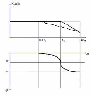 Реальная ФЧХ отличается от идеальной незначительно (<6°). На частоте среза (граничной частоте) фазовый сдвиг составляет 45°, а на частоте 10 сдвиг не превышает 90°.