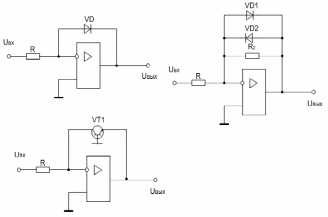 Логарифмический усилитель на инвертирующей схеме (рис.7.6а) диод VD включается между выходом и инвертирующим входом.