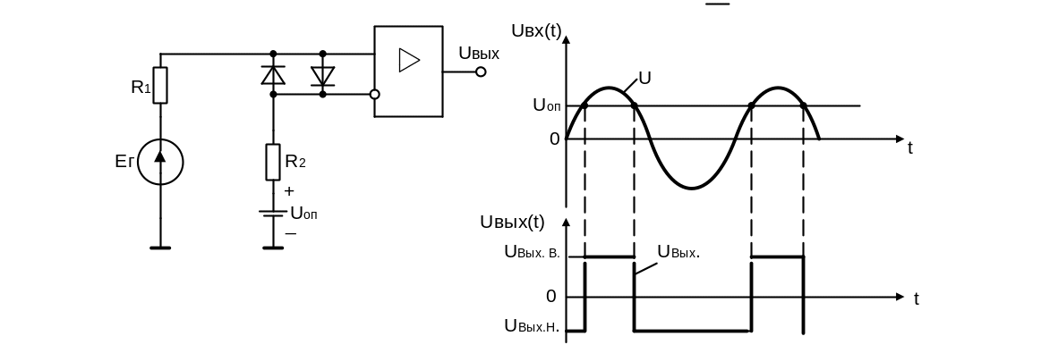 Триггер Шмидта используется для преобразования входного переменного напряжения произвольной формы в последовательность прямоугольных импульсов. Напряжение гистерезиса составляет единицы мВ и регулируется выбором R1, R2.