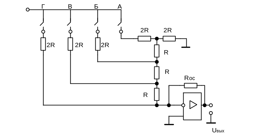 Рисунок 2.48Cхема ЦАП лестничного типа на резистивной