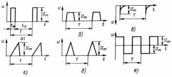 Виды видеоимпульсов: прямоугольный (рис.3.1а), трапецеидальный (рис.3.1 б), экспоненциальный (остроконечный) (рис.3.1 в), пилообразный (рис.3.1г), треугольный (рис.3.1 д). Различают видеоимпульсы положительной (рис.3.1 а, б, г, д) и отрицательной (рис.3.1 в) полярности, а также двусторонние - разнополярные импульсы (рис.3 е).