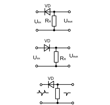 Входное напряжение распределяется между диодом VD и резистором нагрузки; т.к. сопротивление диода в прямом направлении намного меньше сопротивления резистора, положительная полуволна целиком выделяется на выходе. Отрицательная полуволна полностью выделяется на диоде VD (т.к. сопротивление диода в обратном направлении намного меньше сопротивления резистора).
