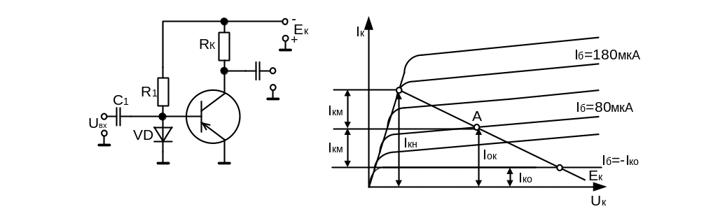 При нарастании отрицательной полуволны входного напряжения рабочая точка перемещается вдоль нагрузочной прямой вверх, Uк растёт, а Uкэ падает.