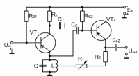 Значение сопротивления резистора R2 можно подобрать так, чтобы полностью скомпенсировать потери в контуре и получить синусоидальные колебания неизменной амплитуды. Конденсатор предотвращает соединение по постоянному току базы транзистора VT2 через катушку L с (‘’землёй’’) чем сохраняется режим базы.