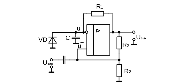 За счет этого в процессе зарядки конденсатора напряжение на входе (–) может превышать по абсолютному значению напряжение на входе (+), в результате чего напряжение на выходе скачкообразно изменяет знак.