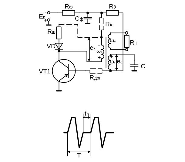 Резисторы Rк, Rдоп, Rши диод VD(показанные пунктиром на рис. 3.41) улучшают форму и стабильность параметров генерируемых колебаний.