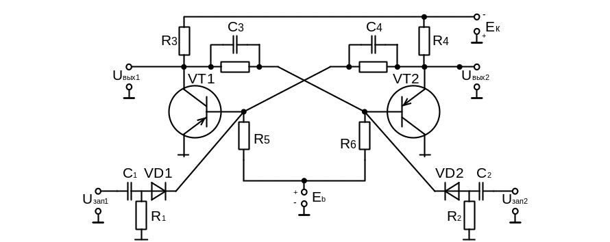 Положительный прямоугольный импульс, поступающий на один из входов, дифференцируется, и соответствующий фронту положительный остроконечный импульс через разделительный диод VD1 или VD2 воздействует на базу насыщенного транзистора. Следующее переключение схемы произойдет под действием импульса, поступившего на другой вход.