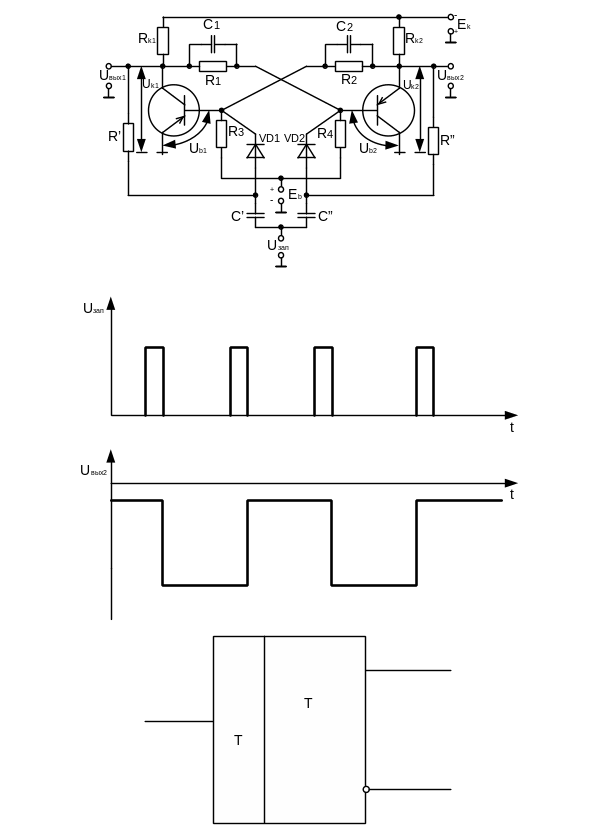 Вслед за этим обратного опрокидывания не произойдет, так как на анод VD2 кроме запускающего импульса приложено запирающее напряжение с конденсатора , состояние которого за время опрокидывания не изменяется. Поэтому к открывшемуся транзистору VT2 положительный импульс с входа сейчас не пройдет.