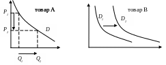 Если упадет цена товара А с Р1 до Р2, то покупатели увеличат величину спроса, двигаясь вдоль кривой в соответствии закону спроса с Q1 до Q2. Но возможности покупателей ограничены: купив товар А, они потеряли интерес к товару В и покидают рынок товара В, а значит, на него уменьшается спрос, из положения D1 кривая спроса сдвинется влево в положение D2.