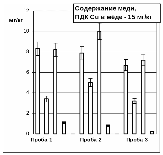 Оценка содержания ТМ в гречишном мёде показала, что мёд в пробе 1 не соответствовал требованиям СанПин – 2.3.2.1078-01 (п.1.5.6), а содержания кадмия было на уровне допустимых концентраций (рис. 1). Остальные пробы соответствовали требованиям нормативного документа на мед.