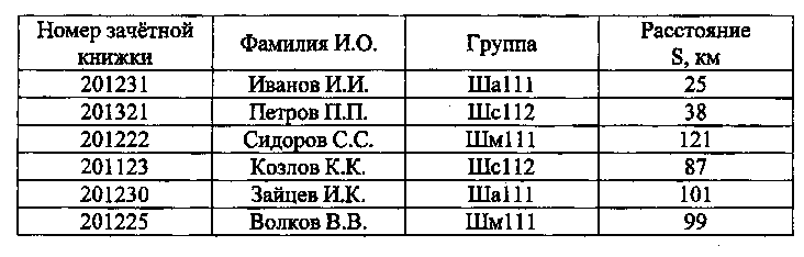 Пример 3.6. В табл.3.11 приведено расстояние до места жительства родителей студентов. Ставится задача составления списка студентов, чьи родители живут на расстоянии более 100 км (S>100).