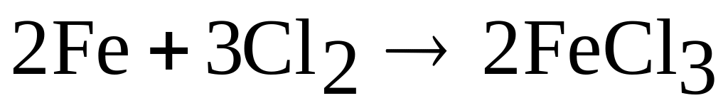 1. Хлор – активный окислитель. Он энергично реагирует с металлами и неметаллами (за исключением О2, N2, He, Ne, Ar, благородных газов) с образованием хлоридов. Реакции простых веществ с хлором протекают спокойнее, чем со фтором.