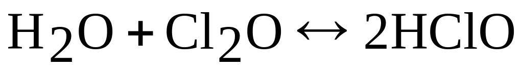 Оксид хлора (I) неустойчивое соединение, при небольшом нагревании, при соприкосновении с органическими веществами разлагается со взрывом на Cl2 и О2. Cl2O хорошо растворим в воде (при температуре 0 ºС в одном объеме воды растворяется 200 объемов Cl2O). При растворении в воде образуется хлорноватистая кислота HClO: