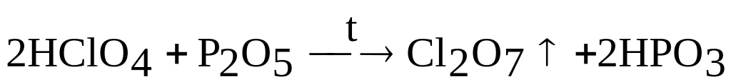 Оксид хлора (VII) Cl2О7 – маслянистая бесцветная жидкость. Очень взрывоопасен. Получают путем взаимодействия оксида фосфора (V) с концентрированной хлорной кислотой: