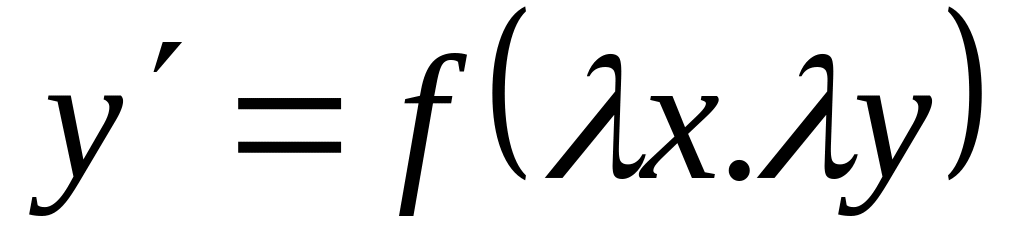 Функцію f(x ,y) називають однорідною відносно змінних , якщо виконується умова f(λx,λy)=f(x,y) (4.8).