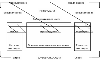 Дифференциация означает деление в организации работ между ее частями или подразделениями таким образом, чтобы каждая из работ получила определенную степень завершенности в рамках данного подразделения. Рис.1 иллюстрирует идею того, как отдельные части или подразделения организации имеют дело с различными аспектами общего внеорганизационного окружения.
