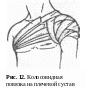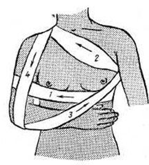 Далее бинт охватывает локтевой сустав и, поддерживая предплечье, направляется косо вверх в подмышечную впадину здоровой стороны, затем переходит по задней поверхности грудной клетки, направляется на больное надплечье, опускается вниз, огибает предплечье и направляется на заднюю поверхность грудной клетки в подмышечную впадину здоровой стороны.