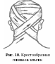Обернуть бинт снова вокруг завязки и вести по лобной части головы выше закрепляющего тура.