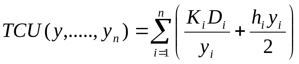 Допустим, что запас продукции каждого вида пополняется мгновенно и скидки цен отсутствуют. Предположим далее, что дефицит не допускается. Пусть , и – интенсивность спроса, затраты на оформление заказа и затраты на хранение единицы продукции в единицу времени для i-го вида продукции соответственно. Общие затраты по продукции каждого вида, по существу, будут теми же, что и в случае эквивалентной однопродуктовой модели. Таким образом, рассматриваемая задача имеет вид минимизировать
