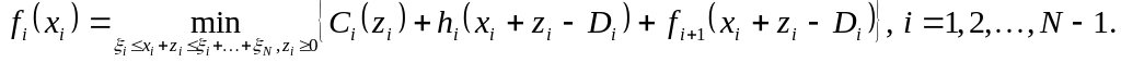 Пусть fi(xi+1) – минимальные общие затраты на этапах 1, 2, … , N при заданной величине запаса xi+1 на конец этапа i. Тогда рекуррентное уравнение записывается в виде
