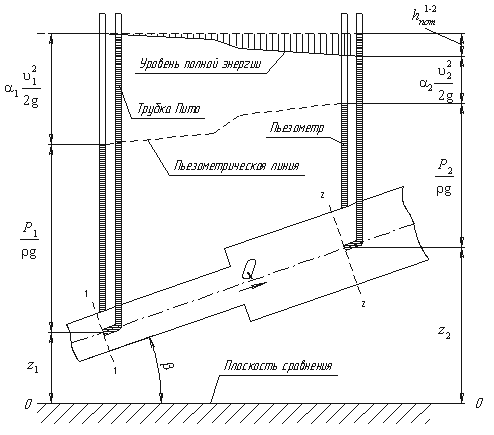 Из рис.3.6 видно, что по мере движения жидкости от сечения 1-1 до сечения 2-2 потерянный напор все время увеличивается (потерянный напор выделен вертикальной штриховкой). Таким образом, уровень первоначальной энергии, которой обладает жидкость в первом сечении, для второго сечения будет складываться из четырех составляющих: геометрической высоты, пьезометрической высоты, скоростной высоты и потерянного напора между сечениями 1-1 и 2-2.
