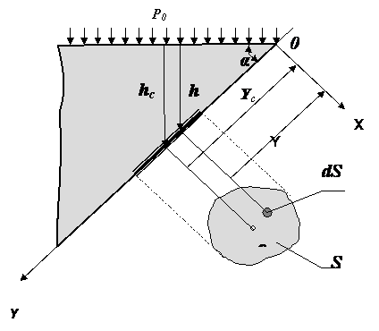 Рассмотрим произвольную площадку ds, расположенную на плоской наклонной стенке сосуда с жидкостью на расстоянии Y от оси X, и определим силы, действующие на эту площадку. Сила от давления, действующего на элементарную площадку dS, будет описываться формулой: