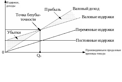 Графически точка безубыточности определяется как пересечение графиков валового дохода и валовых издержек (рис. 4).
