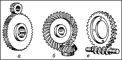 Так как силы трения между зубьями малы, то силу давления между ними F можно считать направленной по общей нормали к соприкасающимся поверхностям зубьев, т. е. по линии зацепления (см. рис. 1). Составляющие этой силы: в цилиндрических прямозубых (рис. 1) и шевронных передачах - окружная сила Ft и радиальная сила Fr; в конической прямозубой (рис. 2) и цилиндрической косозубой (рис. 3) передачах - окружная сила Ft радиальная сила Fr, и осевая сила Fa.