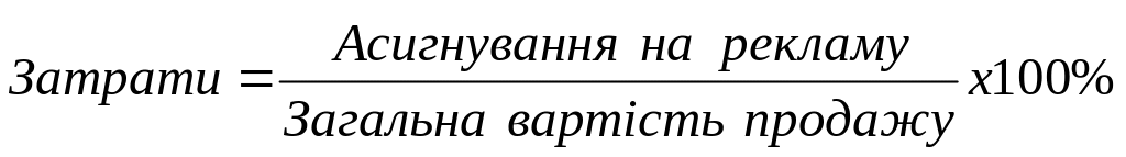 Найчастіше користуються показником процентного відношення затрат на рекламу до загальної вартості продажу: