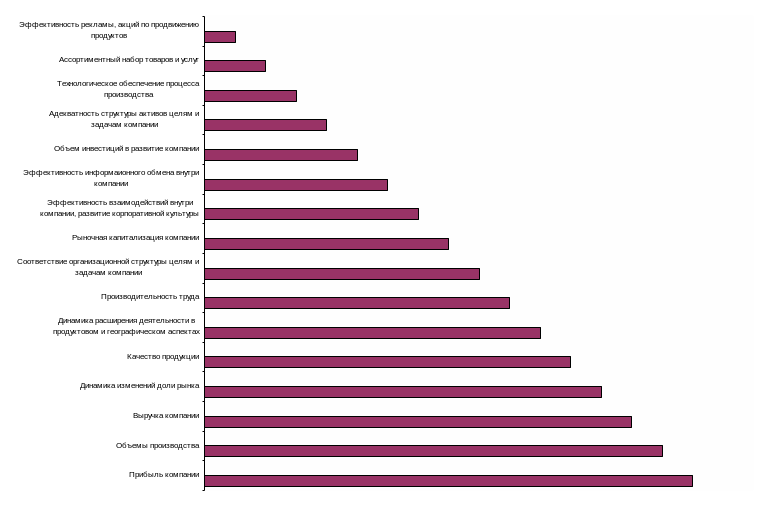 Что касается абсолютных показателей эффективности, то традиционные показатели — прибыль, объемы производства и выручка компании — основные. Безусловно, перечень показателей, принимаемых компаниями в качестве ключевых, зависит от миссии и стратегии организации. Для российских предприятий большое значение имеют доля рынка, динамика расширения деятельности компании в продуктовом и географическом аспектах, качество продукции и производительность труда. Показатели, характеризующие качество управления, имеют невысокий приоритет, что связано с трудностями адекватной оценки этих сложно формализуемых показателей. Исследования Ассоциации менеджеров показывают, что рыночная капитализация компании пока не является приоритетной, но это связано с тем, что большинство компаний непубличные.