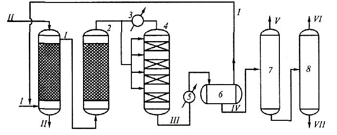 1 - скруббер; 2 - адсорбер; 3 - теплообменник; 4 - колонна синтеза; 5 - холодильник; 6- сепаратор; 7, 8- ректификационные колонны; /- синтез-газ; //- вода; Щ- реакционные газы; IV- метанол-сырец; V'- диме-тиловый эфир; VI-метанол; УП- высшие спирты