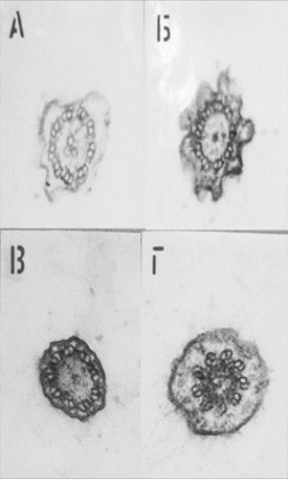(б) Поперечный и продольный срезы. На правой – микротрубочки с белками – MAP (microtube associated proteins), белки распределены более-менее равномерно.