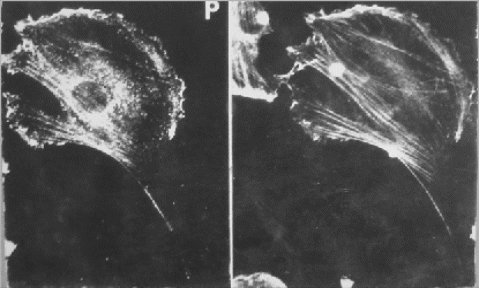 (а): Фибробласт с окрашенными актиновыми филаментами,