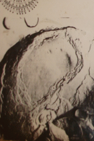 (а): слева, сверху вниз: 1 – эритроцит нормальной формы, 2 –воздействие на клетку, 3 – зоны контакта актиновых филаментов. Справа: тень эритроцита, рвется и смотрим на мембрану изнутри. Сеть.