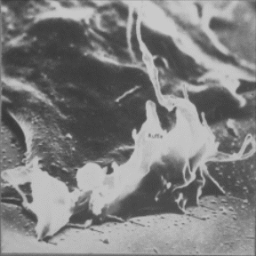 (а): Фибробласт, который только осел и ищет, куда ему распластаться. Филоподии – актиновые филаменты в мембране.