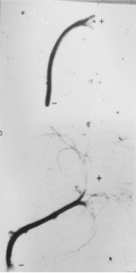 (в) 2 микротрубочки: верхняя находилась в среде с низким содержанием тубулина. Видна сборка, но неактивная. Внизу – среда с большим количеством g-тубулина, видна сборка, в том числе и на «-» конце.