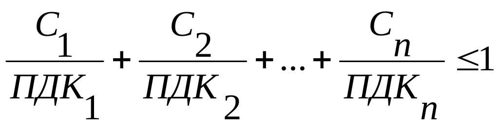 При одновременном содержании в воздухе рабочей зоны нескольких вредных веществ однонаправленного действия (по заключению органов государственного санитарного надзора) сумма отношений фактических концентраций каждого из них (С1, С2 ..., Сn) в воздухе к их ПДК (ПДК1, ПДК2... ПДКn) не должна превышать единицы: