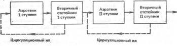Стадийность процесса биохимического окисления органических веществ положена в основу ступенчатой очистки сточных вод (рис. 1). В аэротенке первой ступени завершается первая стадия очистки: сорбция органических загрязнений активным илом и окисление некоторой части задержанных загрязнений. Неполностью очищенная сточная вода поступает в аэротенк второй ступени, где происходит окончательная очистка воды. Двухступенчатая очистка может осуществляться как с регенерацией, так и без нее. Обычно регенераторы предусматривают для каждой ступени очистки сточной воды. Ступенчатую очистку целесообразно применять при высокой концентрации загрязнений в сточных водах. В аэротенках практически можно достичь полной степени очистки.