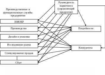 Руководителю (проекта) программы, например, по освоению какого-то рынка определенной продукции, передаются от руководства предприятия необходимые полномочия по распределению ресурсов, а также исполнению мероприятий, составляющих программу. Руководителю маркетинговой программы временно подчиняются не только сотрудники соответствующих маркетинговых служб, но также и сотрудники подразделений, занимающихся разработкой и доведением до производства соответствующего продукта (на рис. 9 это показано стрелками, выходящими за пределы рисунка). Таким образом, каждый участник работ по программе, находясь в штатном расписании соответствующего подразделения, имеет двойное подчинение: по линии программных работ он подчиняется руководителю маркетинговой программы, по всему остальному — своему линейному руководителю.